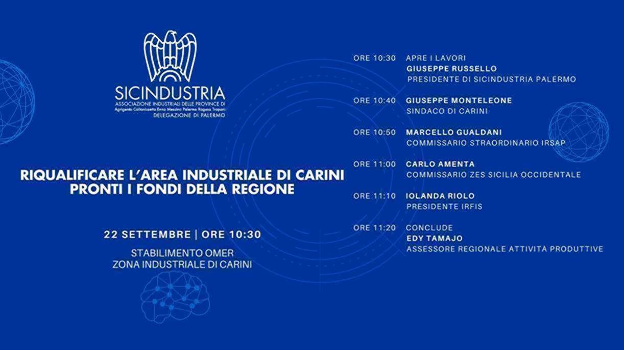 Conferenza stampa di presentazione del progetto di riqualificazione dell’area industriale di Carini, che si terrà presso la Omer venerdì 22 settembre alle ore 10,30.