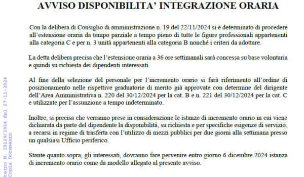 Avviso disponibilità all’estensione oraria da tempo parziale a tempo pieno di tutte le figure professionali interne appartenenti alla categoria C e per n. 3 unità appartenenti alla categoria B