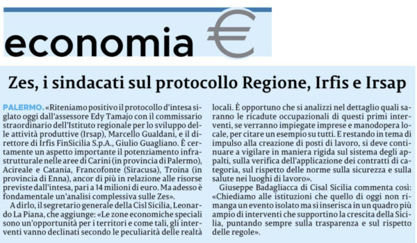 Zes, i sindacati sul protocollo Regione, Irfis e Irsap