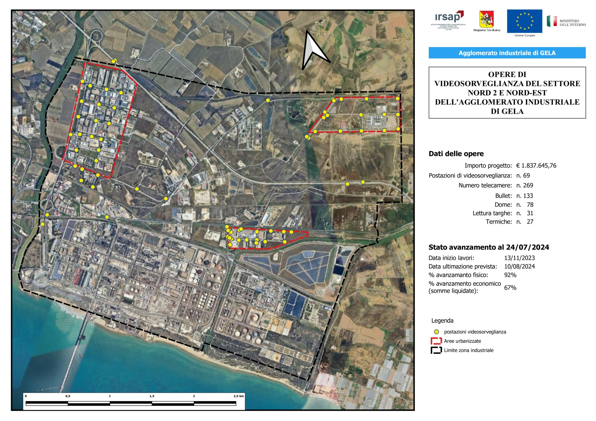 Gli interventi previsti nel progetto riguardano la realizzazione del sistema di videosorveglianza dell’area industriale di Gela, in particolare nel settore Nord 2 e Nord-Est.
