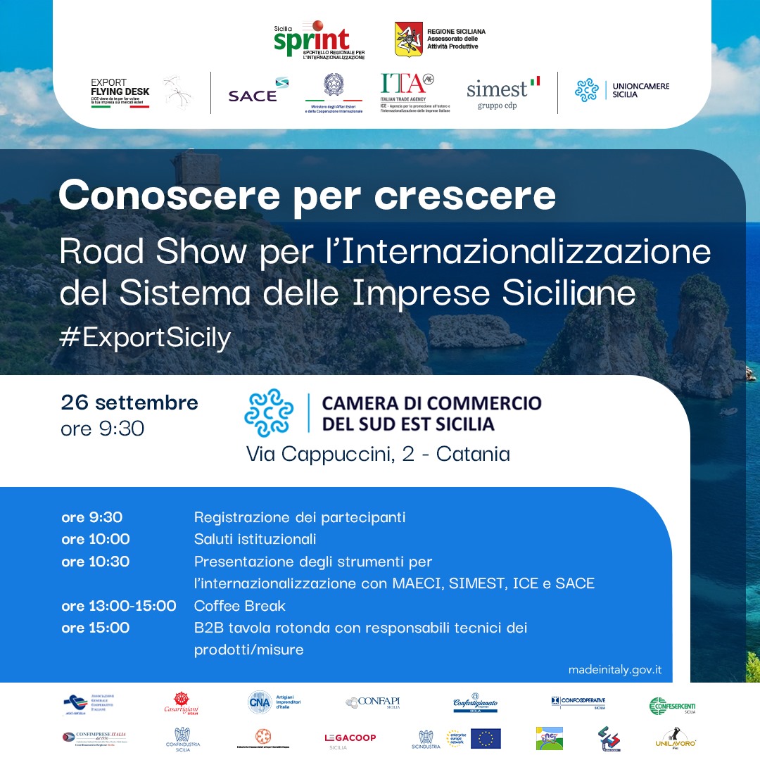 In data 26 Settembre si terrà a Catania presso la Camera di Commercio del Sud Est Sicilia in via Cappuccini 2 , un workshop per l’internazionalizzazione del sistema delle Imprese siciliane.